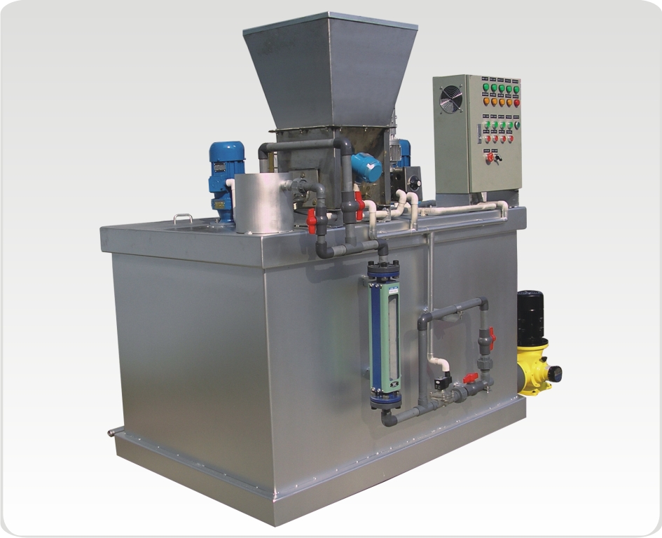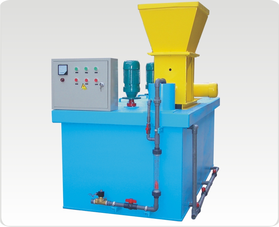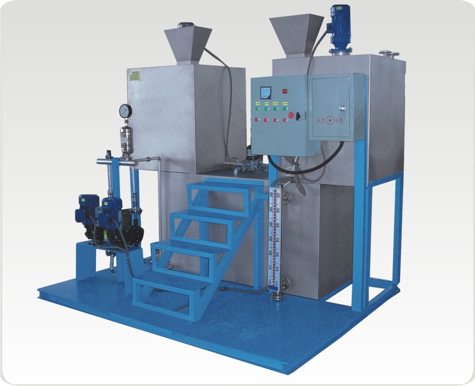 本裝置是粉狀(或液態)高分子凝絮劑的全自動連續配置及投加系統。干粉絮凝劑從螺旋推進器內進入預混器與清水進行預混,被濕潤的物料進入配制槽進行X釋,按要求濃度進行配制;若為液態絮凝劑則由螺桿泵直接投加到配制槽中。配制過程中,若水量產生變化,則絮凝劑投加裝置自動跟隨水流量的變化,從而保證在整個工作過程中,配制溶液濃度不變。